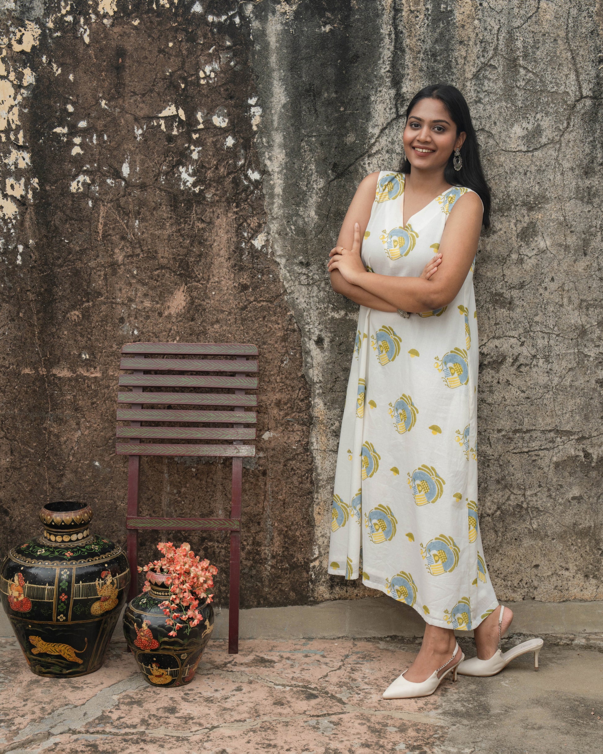 A whisper of summer in every thread—this mul cotton midi is all about ease and charm. The airy white base becomes a playful canvas for block print, scattered like sunlight and breeze across the day. With its flowy A-line silhouette, sleeveless cut, and V-neckline, it’s the kind of dress you slip into and instantly feel lighter. Hidden pockets add that little oh-yes-it-has-them delight, while the breathable fabric moves with you—perfect for long walks, market strolls, or just lounging with chai.