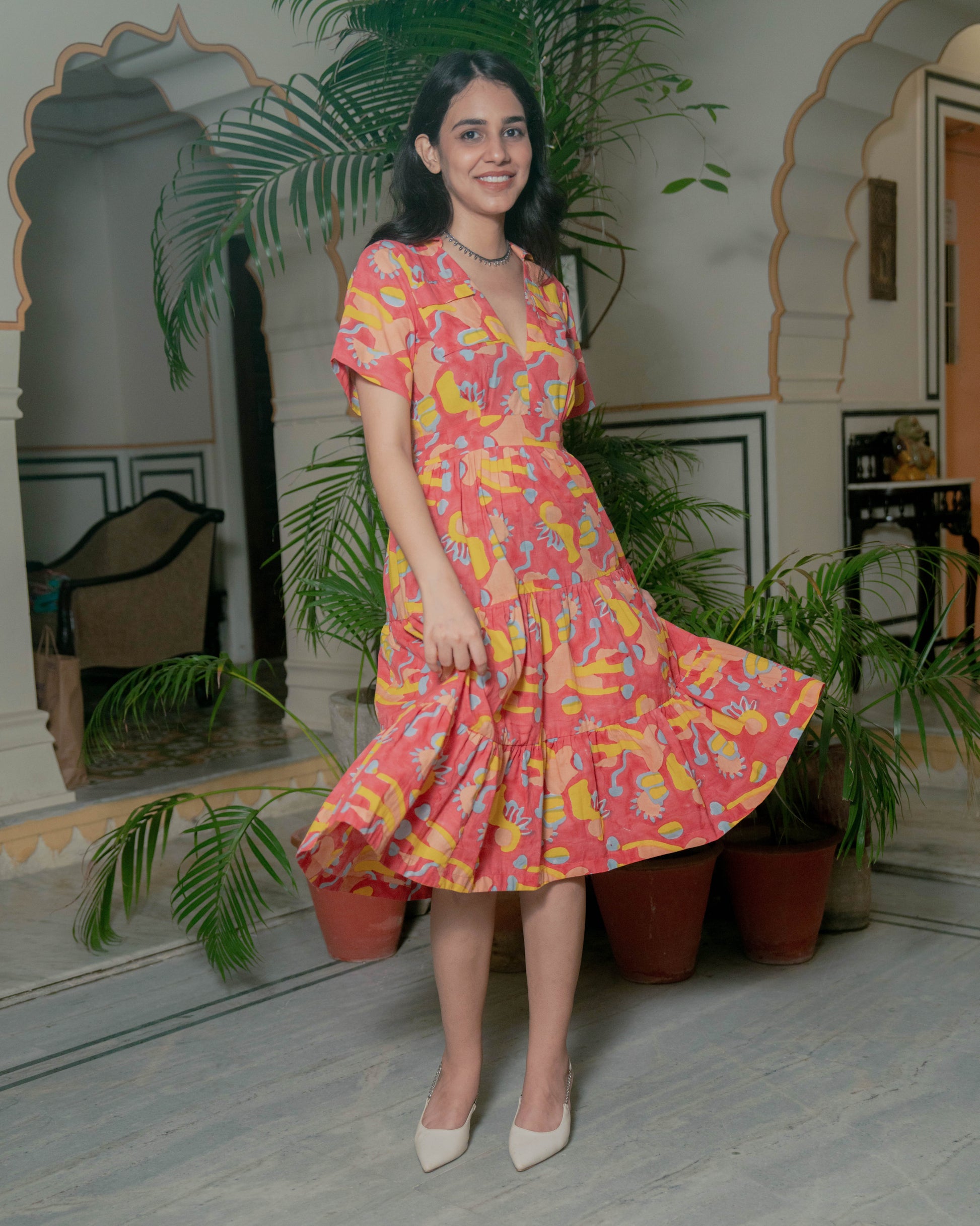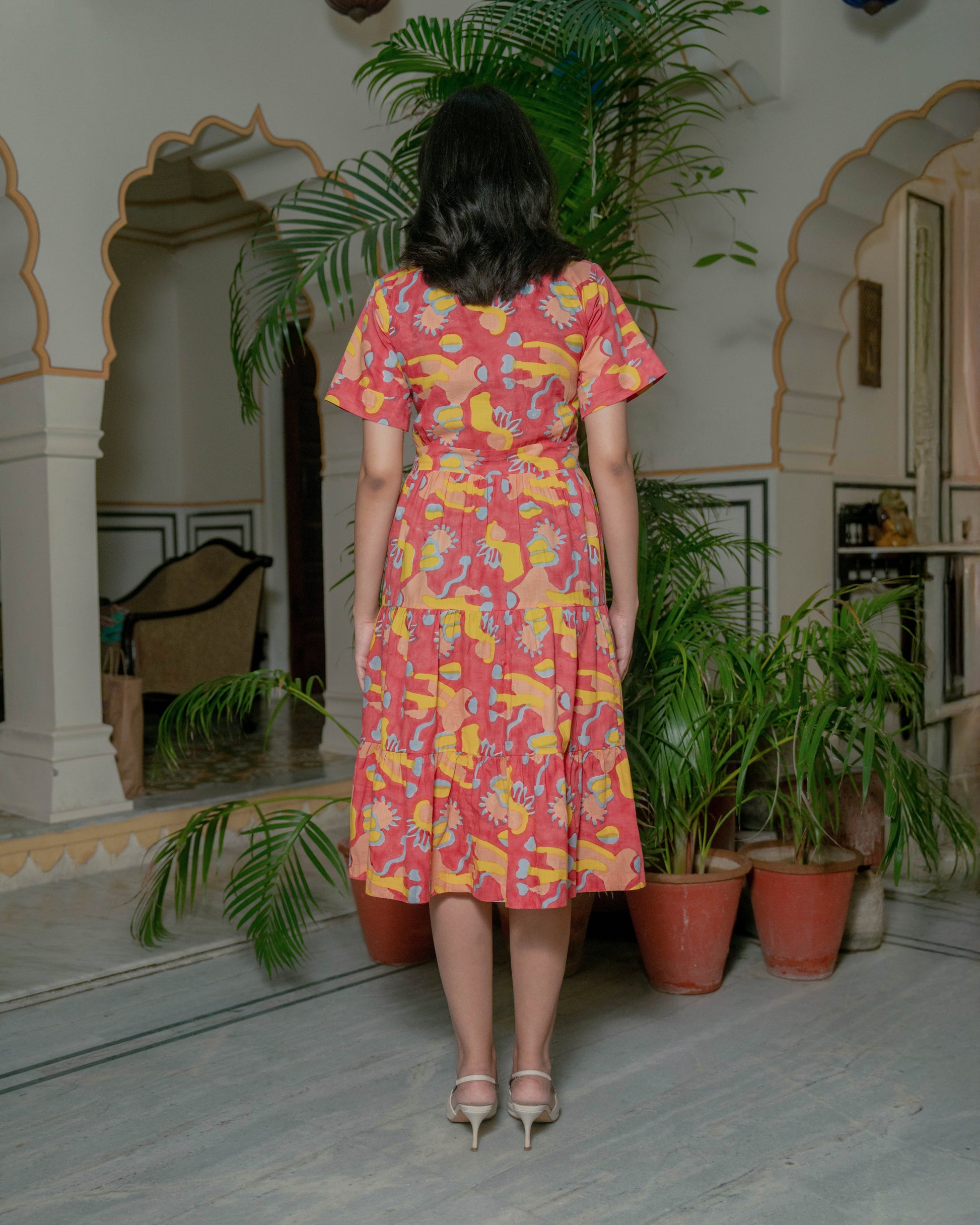 This dress is a sunlit daydream captured in fabric — a cascade of pink, painted with hand-block motifs in yellow and soft blues. The design blooms with playful, abstract floral forms, evoking the joy of summer gardens and festival buntings fluttering in warm breezes. Its silhouette is relaxed yet poised: the notched V-neck with a crisp collar hints at structure, while the softly flared skirt and gathered tiers keep it lighthearted and breezy. Light, breathable cotton lets the dress move like a whisper, as if the it is alive with its own summer melody — a celebration of craft, joy, and the magic of hand-printed stories.