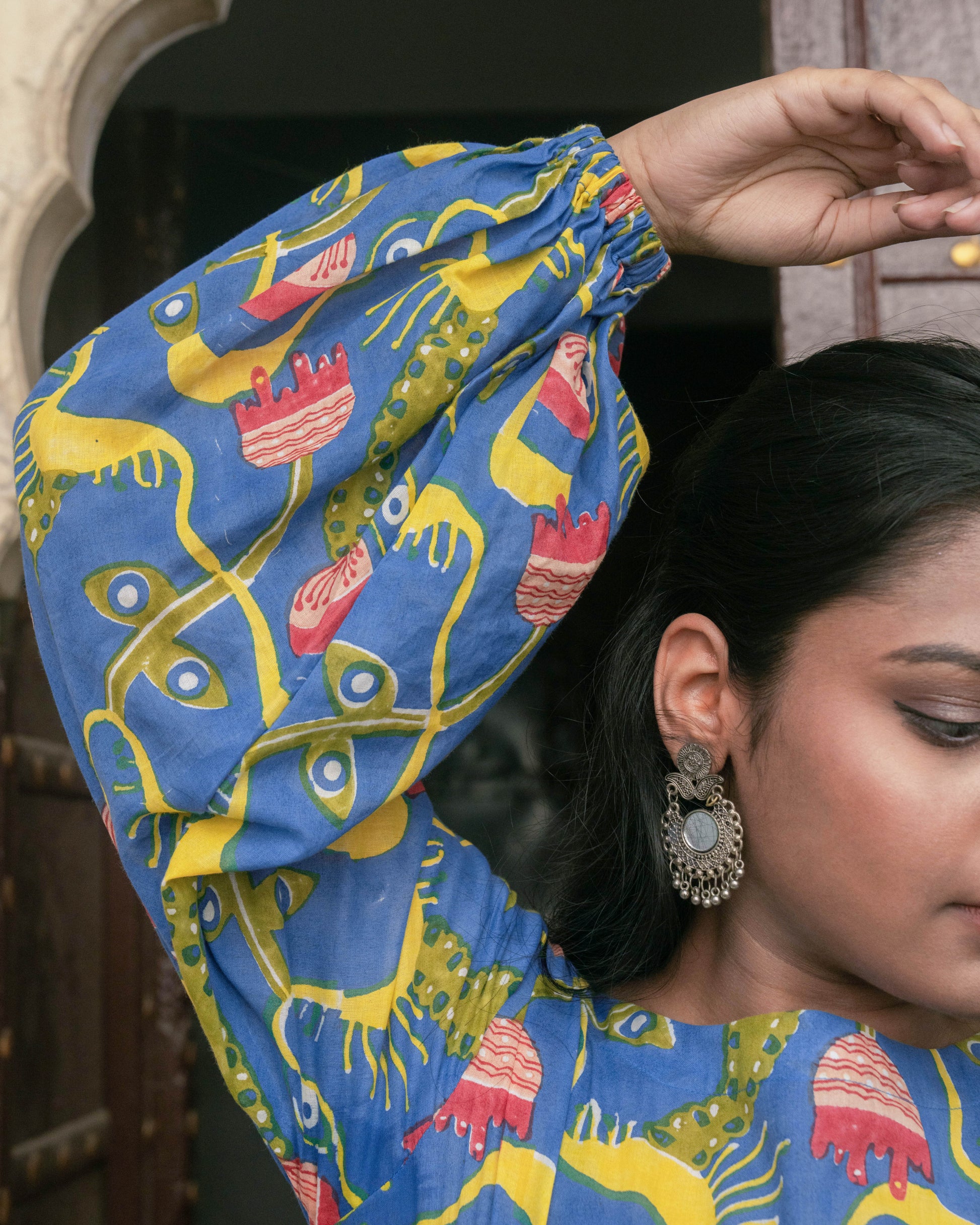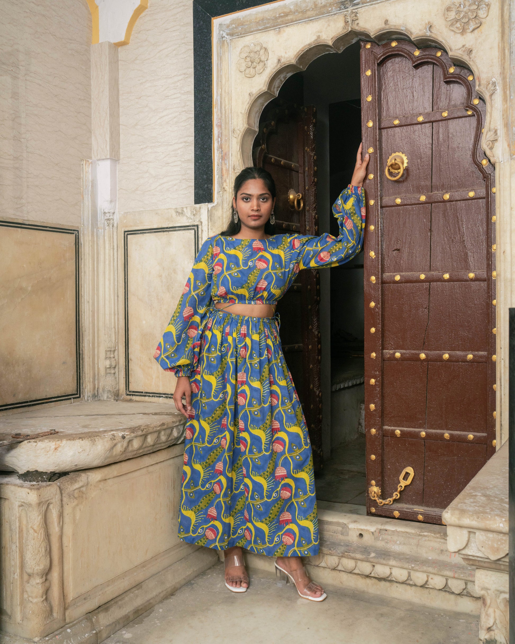 This ensemble feels like a vibrant postcard from a festive Indian summer. The crop top, with its billowing balloon sleeves and gathered cuffs, frames the shoulders with soft drama, while the cinched waist reveals just a hint of midriff for a modern, confident edge. The high-waisted skirt flows with soft gathers, offering graceful movement and a flattering fit. Paired with traditional silver jhumkas, the look strikes a perfect balance between contemporary style and cultural storytelling. Ideal for festive gatherings, art fairs, or a slow evening stroll through heritage streets, itβs a piece that wears its artistry proudly.