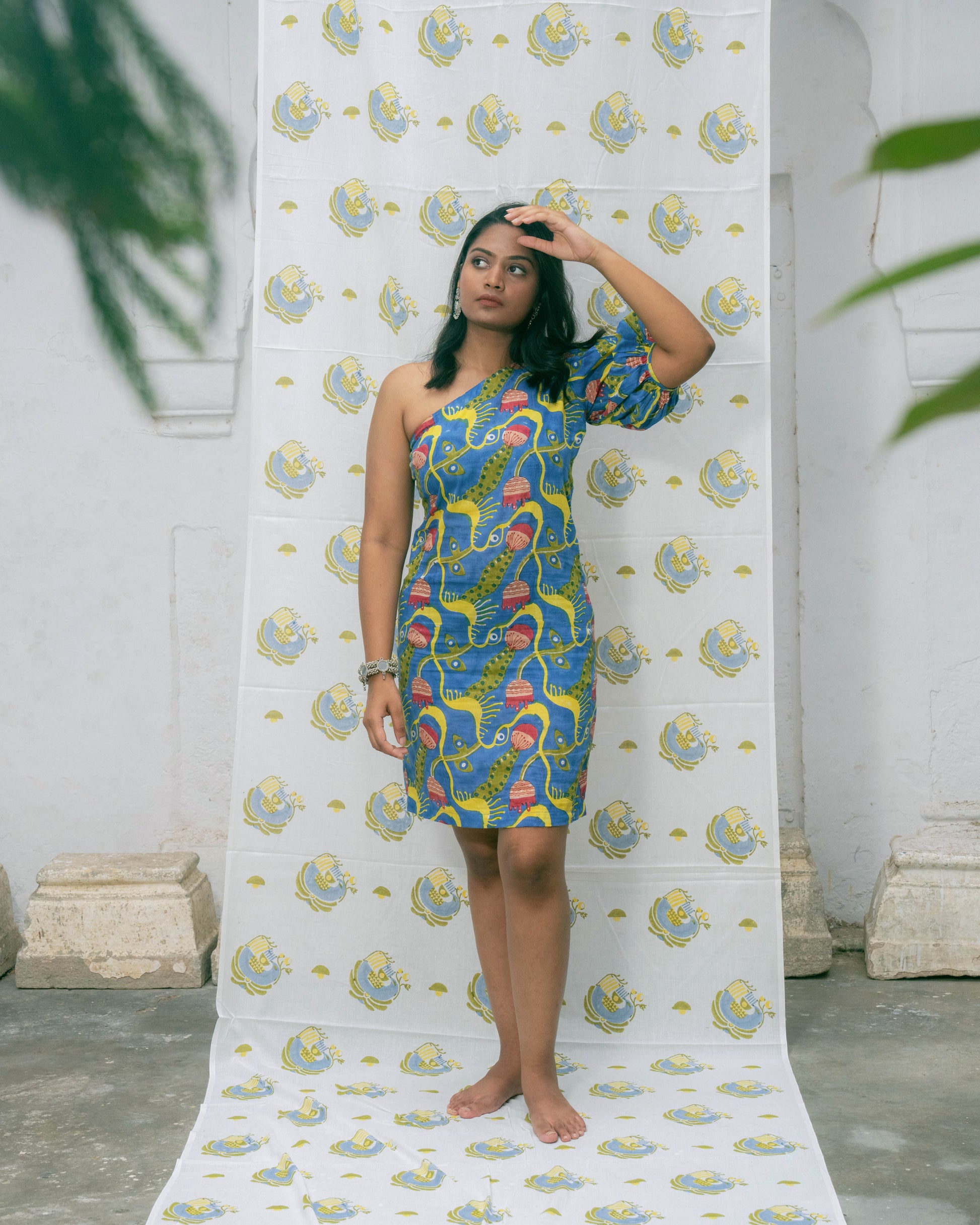 This one-shoulder stunner is like wearing a slice of summer joy. Crafted from soft, breathable mul cotton with a bold, hand block printed pattern ,this print is all about movement and quirkiness. The puffed single sleeve adds that whimsical drama, while the bare shoulder keeps it effortlessly modern and a little flirty. The cotton drapes lightly, making it as comfortable as it is eye-catching, and the above-knee cut keeps it fun and flirty. It’s the kind of piece that belongs in beach town lanes, under string lights at an open-air café, or in your holiday suitcase for that spontaneous island getaway.